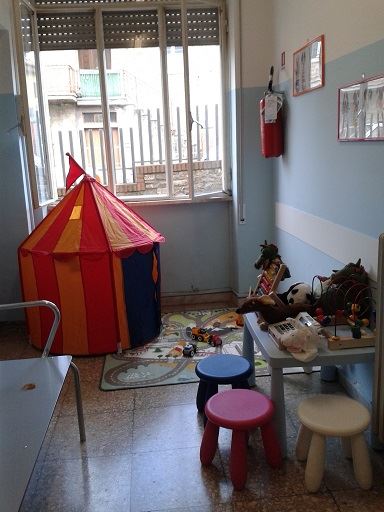 arredi spazio bimbi, compresi quadri che colorano le pareti