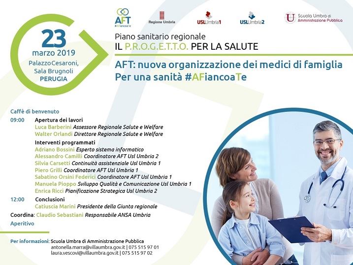 (aun) – Perugia, 23 mar. 019 – “In Umbria si potenzia l’offerta dei servizi sanitari sul territorio: sono ormai operative 38 Aft-Aggregazioni funzionali territoriali, presidi che assicurano una apertura ininterrotta per dare risposte immediate e sempre più complete ai bisogni di salute dei cittadini che avranno a disposizione 24 ore su 24, sette giorni alla settimana, le competenze dei medici di medicina generale e della continuità assistenziale e di infermieri di territorio, senza dover ricorrere ai Pronto soccorso ospedalieri”. Lo ha sottolineato l’assessore regionale alla Salute, Coesione sociale e Welfare, Luca Barberini, aprendo stamani alla Sala Brugnoli di Palazzo Cesaroni l’incontro di presentazione delle Aft, che si è concluso con l’intervento della presidente della Regione Umbria, Catiuscia Marini, al quale hanno preso parte medici, esperti, dirigenti delle Aziende sanitarie e ospedaliere e della Regione Umbria, coordinatori delle Aft delle Usl Umbria 1 e 2.