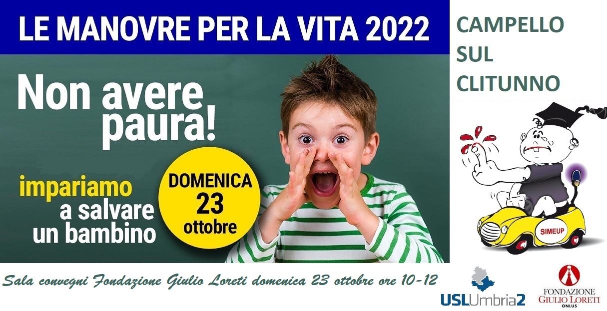 È in programma domenica prossima, 23 ottobre, dalle ore 10:00 alle 12:00, nella sala convegni della Fondazione Giulio Loreti a Campello sul Clitunno, un'importante giornata di formazione e sensibilizzazione promossa dalla Simeup, Società Italiana di Medicina Emergenza Urgenza Pediatrica nell'ambito della manifestazione nazionale "Una manovra per la vita".