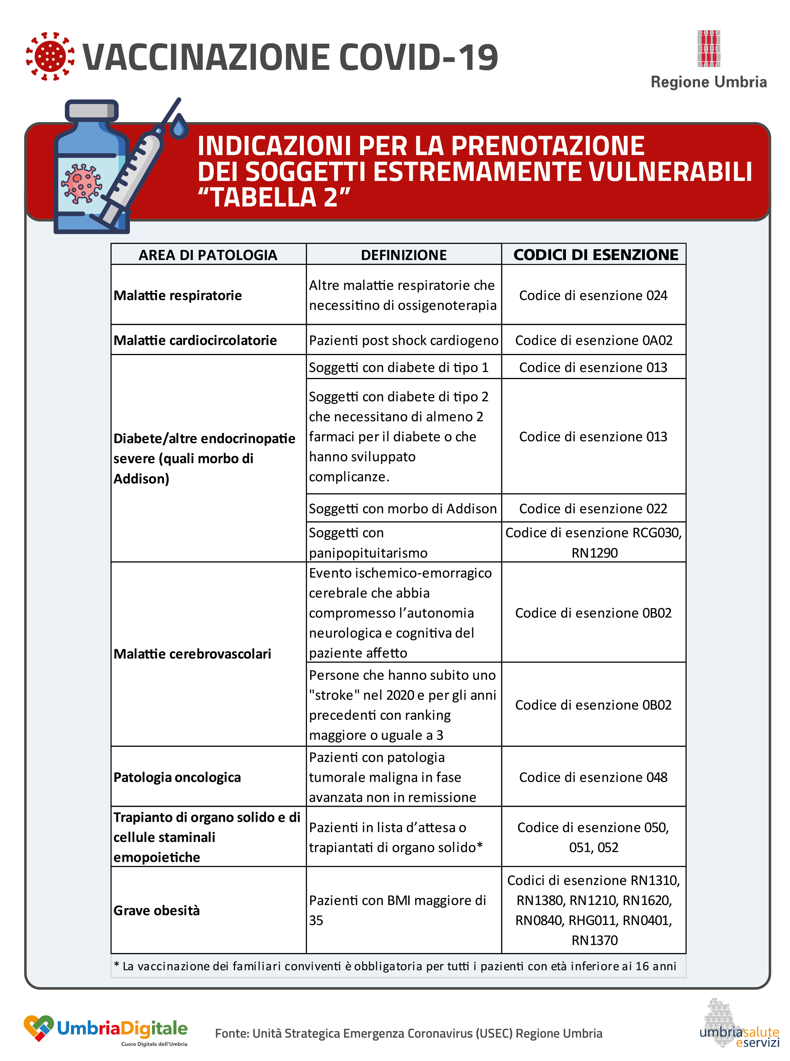 Si allega infine una seconda infografica con allegata Tabella A, relativa alle categorie di soggetti estremamente vulnerabili che hanno diritto alla vaccinazione dei loro caregiver e familiari conviventi, la cui prenotazione avverrà a partire da martedì 6 aprile, tramite portale web o farmacia.